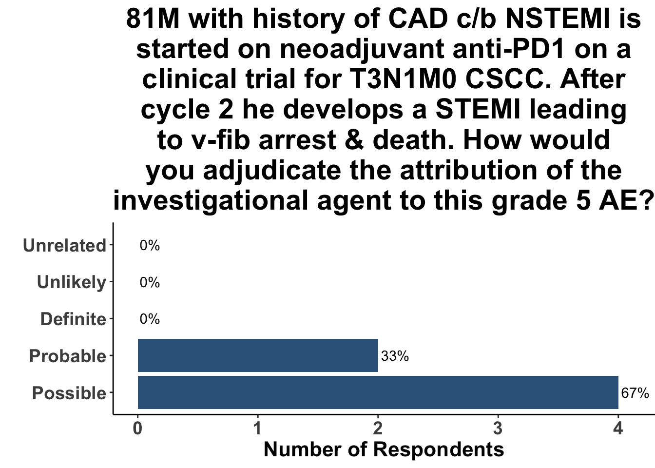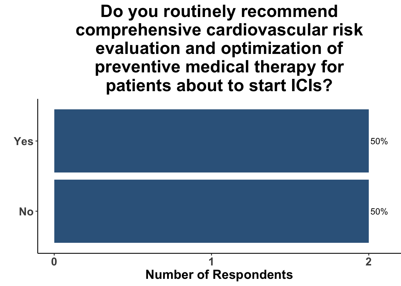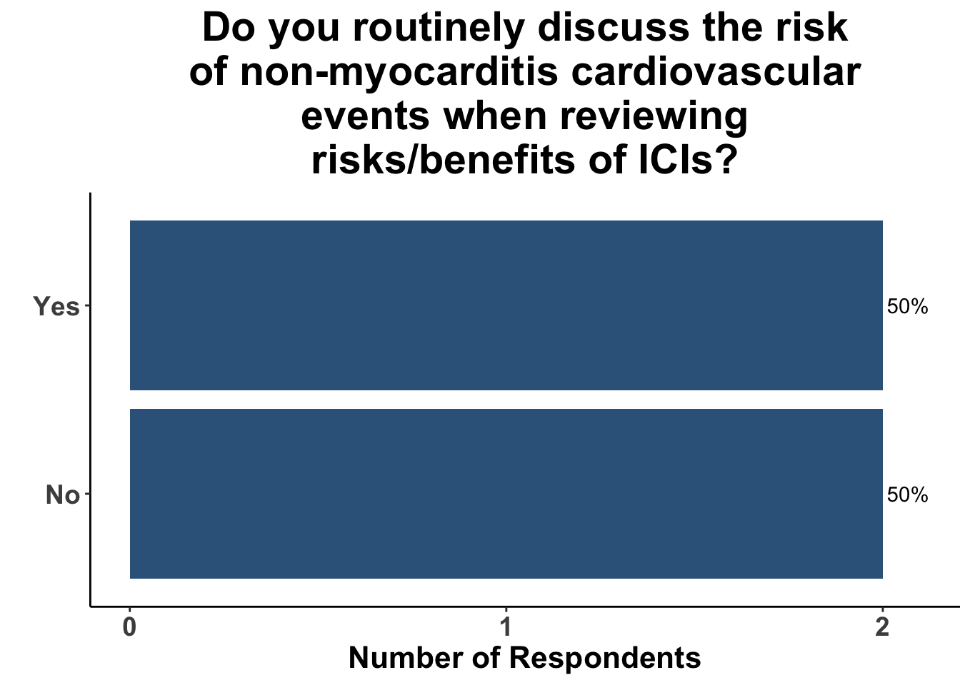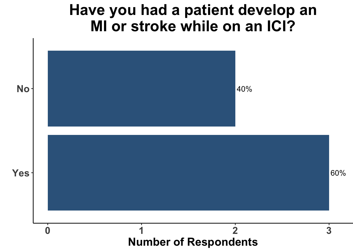 Despite those limitations, the experienced, multi-disciplinary SoCO group present on May 1st (Figure 2 and 3) acknowledged the importance of these data to their practice. The majority of the clinicians reported having had a patient develop a myocardial infarction or stroke while on treatment with an ICI (Figure 4).