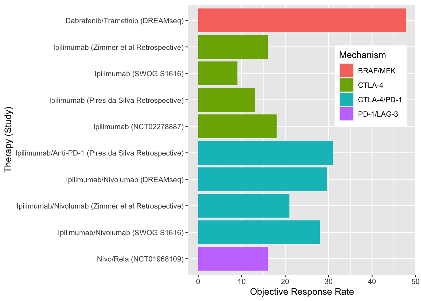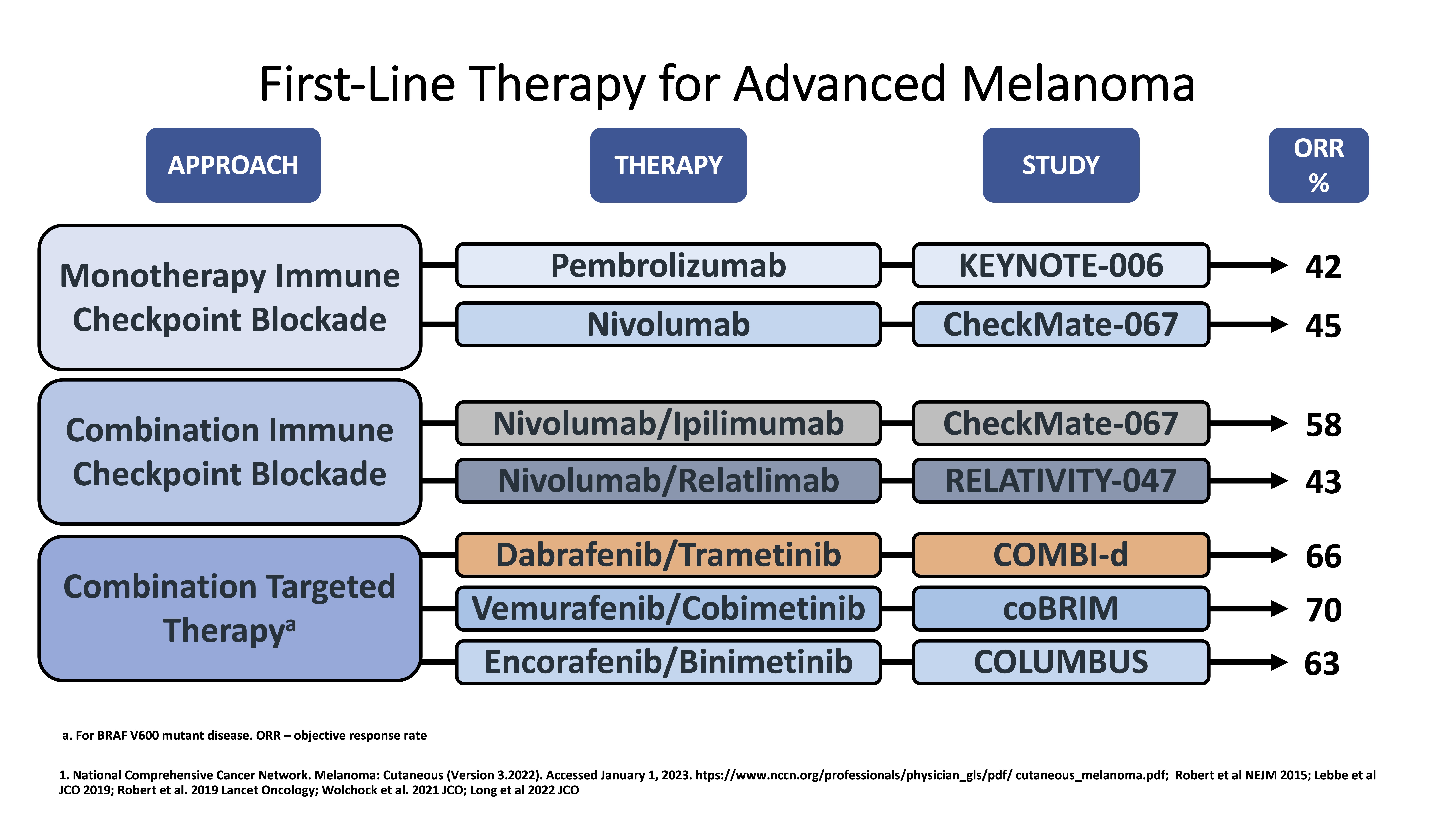 Treatment options for melanoma have advanced greatly in the last several years and continue to evolve (Figure 1). Landmark studies such as KEYNOTE-001/006 and CheckMate-066 have led to single-agent immunotherapy with anti-PD-1 immune checkpoint inhibitors becoming a first-line treatment options for advanced, unresectable melanoma (Figure 2)(Hamid et al. 2019; Robert et al. 2015; Robert, Ribas, et al. 2019; Schachter et al. 2017; Petrella et al. 2017). Subsequent studies such as CheckMate-067 and RELATIVITY-047 have positioned dual immune checkpoint blockade (ICB) with aPD-1/aCTLA-4 and aPD-1/aLAG-3 monoclonal antibodies as additional options in the front-line setting for appropriate patients (Wolchok et al. 2017; Tawbi et al. 2022; Long et al. 2022). In addition combined BRAF and MEK inhibition is an option for melanomas with BRAF mutations (Robert, Grob, et al. 2019; Dummer et al. 2018).