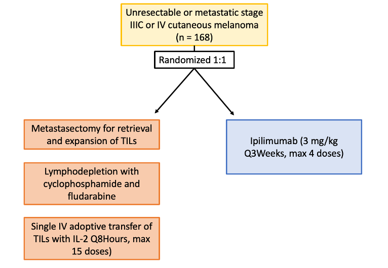 The study by Rohaan et al. was a phase III, multicenter, open-label trial including Dutch patients age 18-75 with unresectable stage IIIC or IV melanoma. Patients were randomized in a 1:1 ratio to receive TIL or anti-cytotoxic T-lymphocyte antigen 4 (CTLA4) therapy (ipilimumab) (Figure 4). Patients assigned to the TIL group underwent a metastasectomy for retrieval and expansion of TILs, then received nonmyeloablative, lymphodepleting chemotherapy with cyclophosphamide and fludarabine. Single intravenous adoptive transfer of TILs was followed by high-dose interleukin-2 every 8 hours, for a maximum of 15 doses. Patients in the ipilimumab group received 3 mg per kilogram of body weight every 3 weeks, for up to 4 doses. The primary end point was progression-free survival, defined as the time from randomization to first disease progression or death. Secondary endpoints included progression-free survival (PFS), objective response, complete response, overall survival, health-related quality of life, and safety.