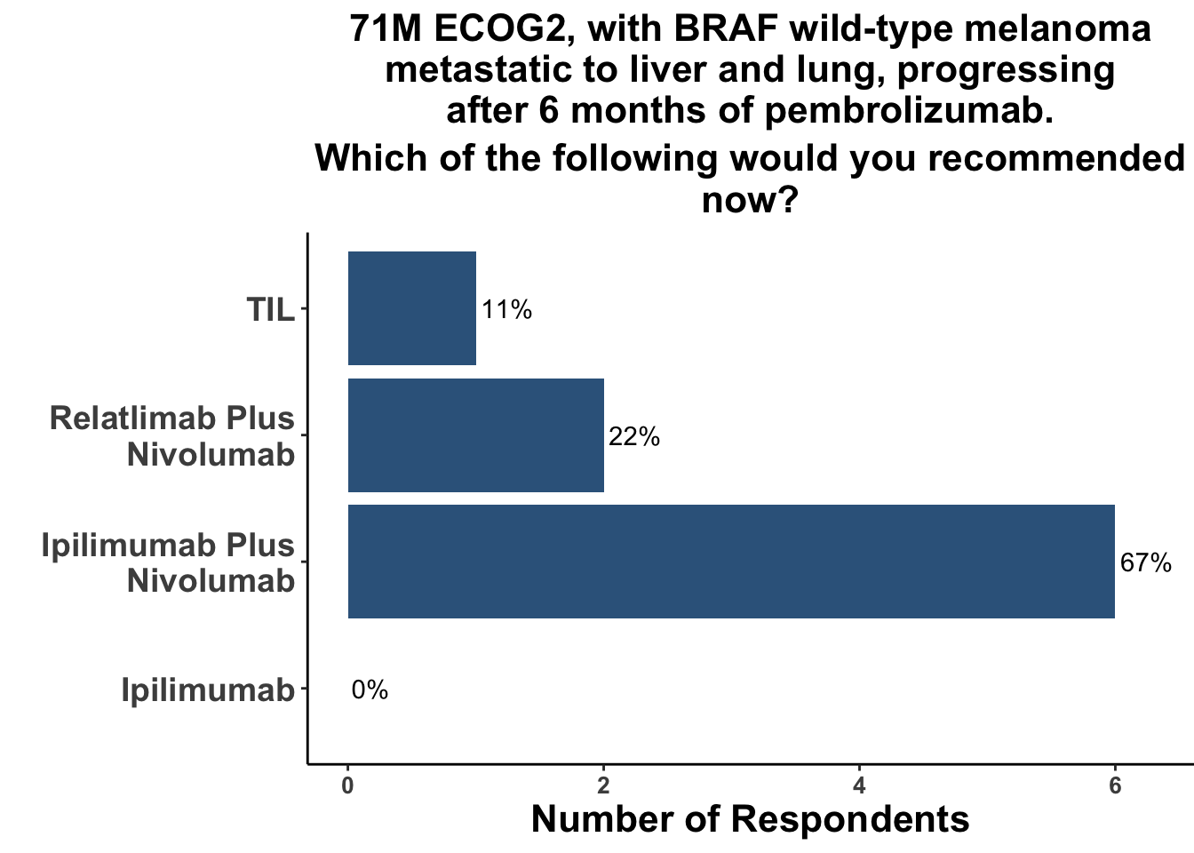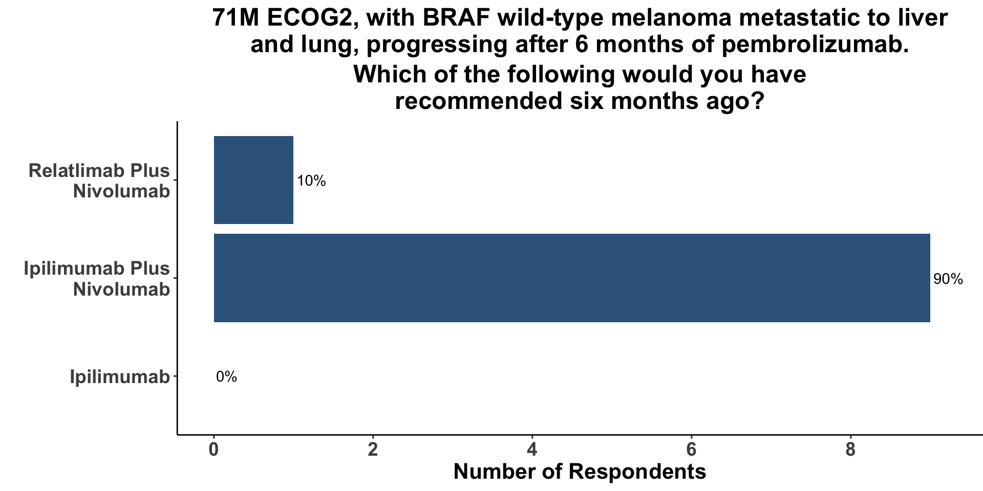 Improving outcomes for patients with ICI-refractory disease is a critical need. The treatment landscape is evolving and clinicians currently only have a few options to choose from when patients progress on first-line anti-PD-1 monotherapy. Commercially-available options include monotherapy ipilimumab, dual ICB with ipilimumab/nivolumab or ipilimumab/relatlimab and combination targeted therapies for patients with actionable BRAF V600 mutations. When provided with a clinical vignette of ICI-refractory wild-type melanoma, the vast majority of the diverse group of CCO attendees at the January 9th journal club that treat melanoma (Figure 5) responded that they would have selected combination ipilimumab/nivolumab (Figure 6). Given the patient’s ECOG status of 2, one respondent replied that they have recommended combination CTLA-4/LAG-3 in this case. None of the practioners would have recommended monotherapy ipilimumab.