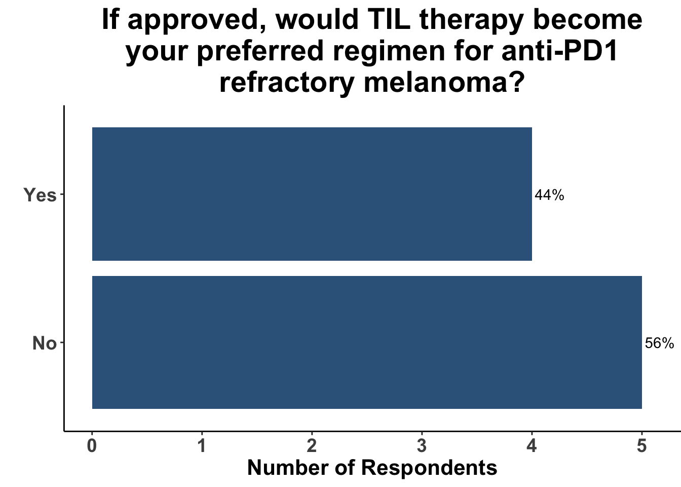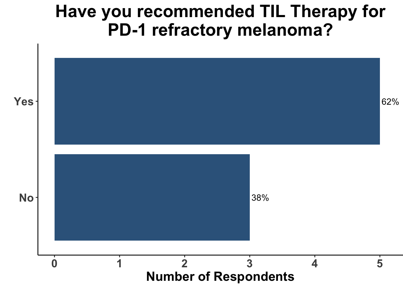 Indeed, when presented with the same case of refractory advanced melanoma, but given the option of having TIL therapy available, only 1/9 clinicians responded that they would recommend TIL therapy (Figure 10).