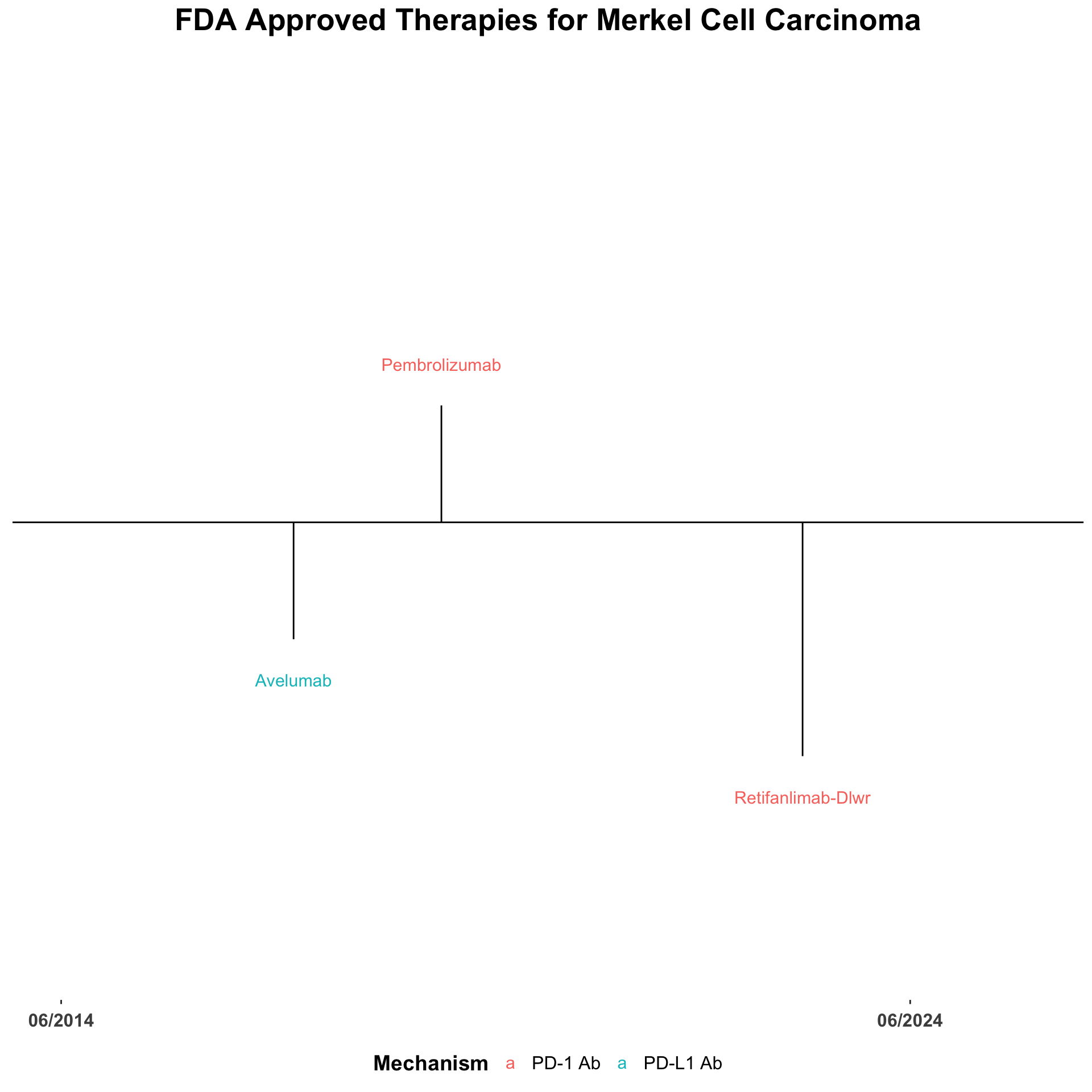 The treatment landscape for advanced Merkel cell carcinoma (MCC) has changed dramatically over the last decade. The utilization of immune checkpoint inhibitors (ICI) for patients with locally advanced or metastatic disease has improved the clinical outcomes for many patients.2–4 There are currently three FDA-approved anti-PD-1/PDL-1 monoclonal antibodies approved for the use in the advanced setting (Figure 2).5 In addition, data from several trials have demonstrated activity of monotherapy nivolumab and combination nivolumab with ipilimumab comparable to the FDA-approved agents (Table 1).6–15