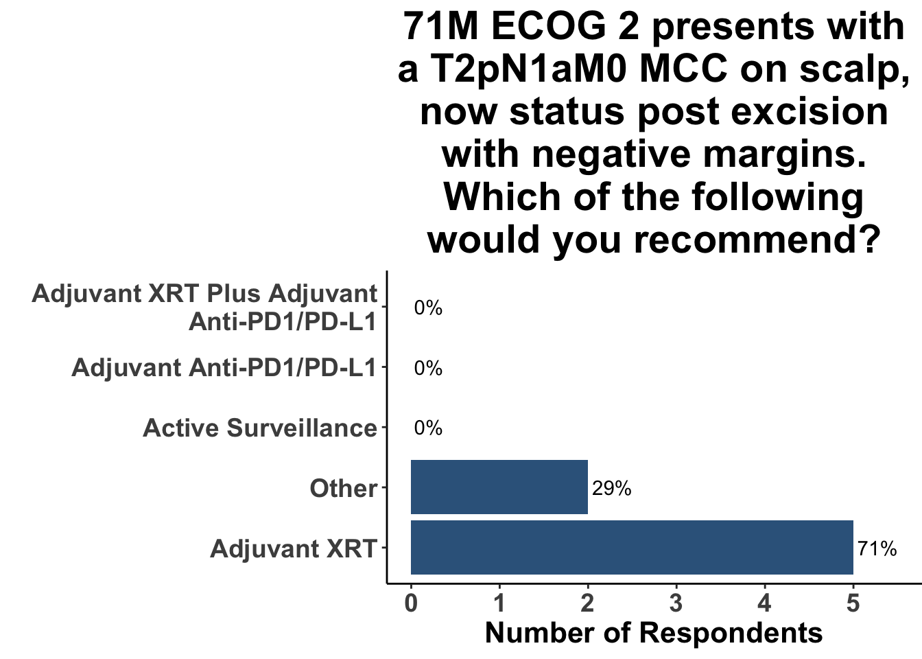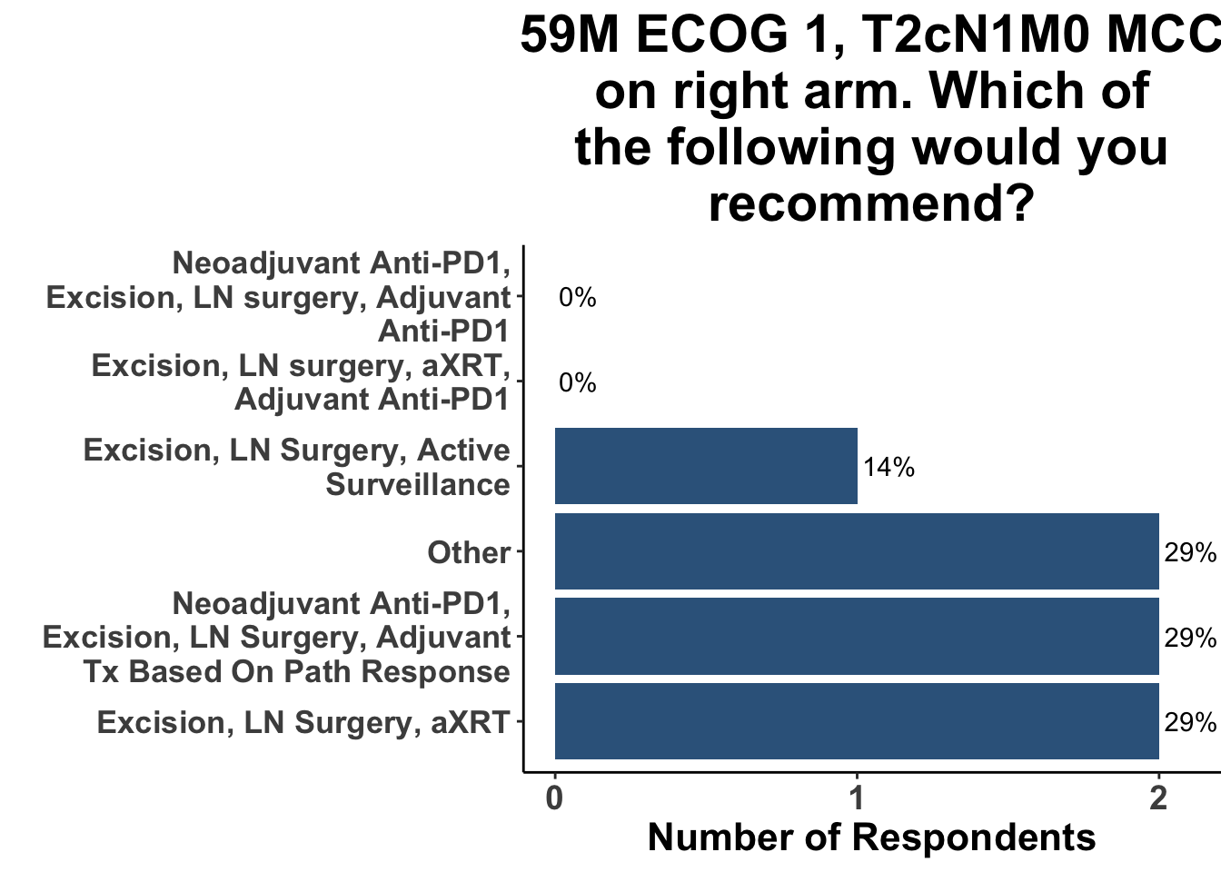 In contrast, the treatment landscape for resectable disease has evolved less substantially. Surgical excision followed by post-operative radiotherapy is commonly used for the management of skin-only and microscopic-nodal disease. As an example, 71% of the clinical participants at the August 4th SoCo Journal Club responded that they would recommend post-operative radiation therapy for a patient with Stage II MCC (Figure 3). Given the benefit of immunotherapy in advanced MCC, along with the success of ICI in the high-risk resectable (HRR) setting in melanoma,16–20 numerous clinic trials have been developed for fully-resected MCC (NCT02196961, NCT03712605, NCT04291885, NCT03271372).