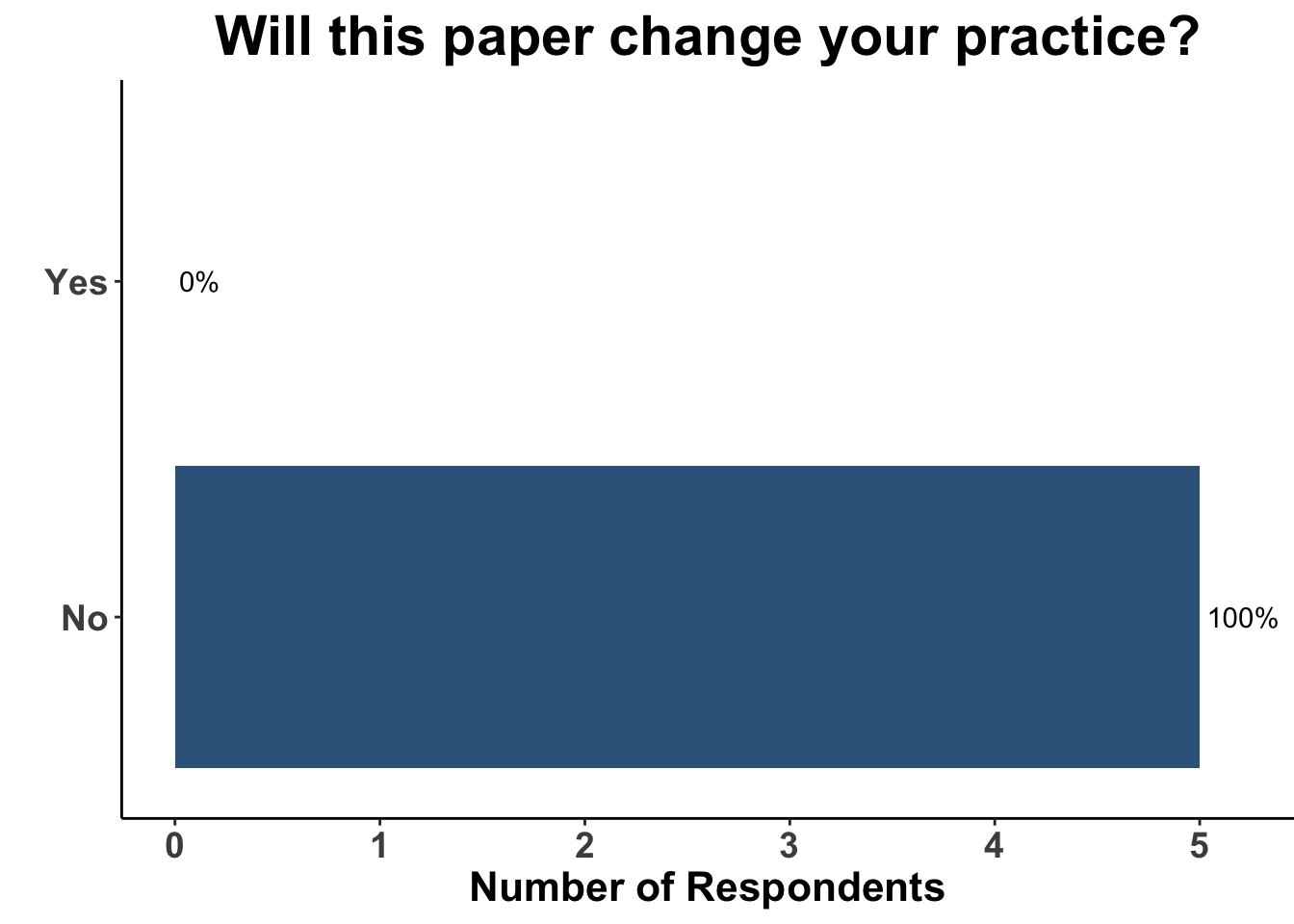 Given these strengths and weakness, what are the clinical implications of this study? When queried as to whether or not this paper would change their practice, there was a rare uniform consensus amongst the August 4th SoCO respondents: not a single clinician responded in the affirmative (Figure 4). To highlight this, when presented with a case of clinical stage III MCC, none of the providers selected a treatment plan commensurate with the experimental group in ADMEC-O (Figure 5).