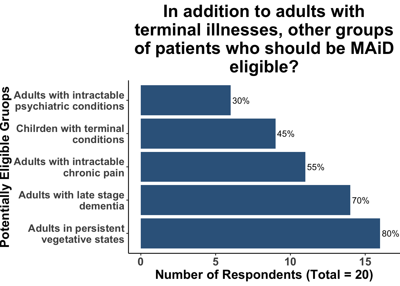 The perspective on adults with intractable chronic pain was more divided, with just over half of the respondents in favor. This viewpoint underscores the role of physical suffering in MAiD eligibility and the potential limits of palliative care in providing relief as well as defining what “intractable” means in this situation. In contrast, a smaller group of respondents considered MAiD for adults with intractable psychiatric conditions, raising critical questions about mental health, decision-making capacity, and the subjective nature of suffering.