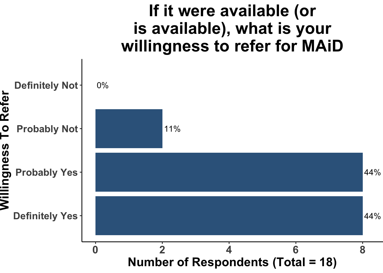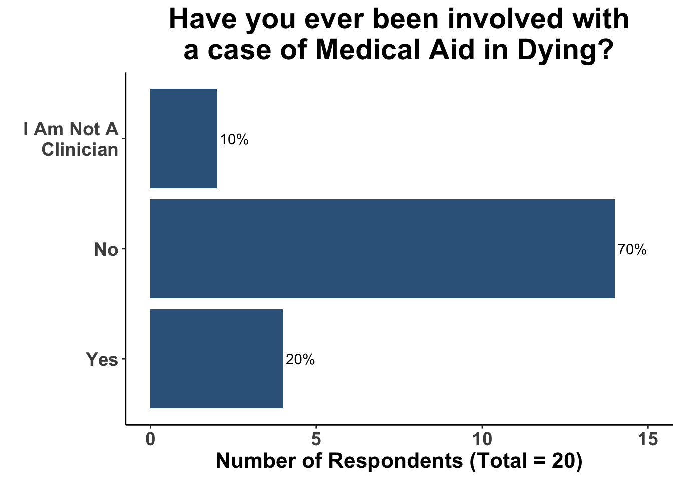 These findings underscore the complexity of MAiD as a medical practice. They reflect a spectrum of ethical considerations, personal beliefs, and professional responsibilities that healthcare providers must navigate in the context of MAiD. During the February 2nd session, we conducted an informal survey to better understand the experience of members of the SoCO Journal Club. A subset of the questions in our survey were adapted from those used in the Colorado study. While a direct comparison is not feasible due to differences in survey design and population, this approach does provide an opportunity for contextual comparison, offering insights into the perspectives of SoCO Journal Club members in relation to those of the physicians surveyed in Colorado.