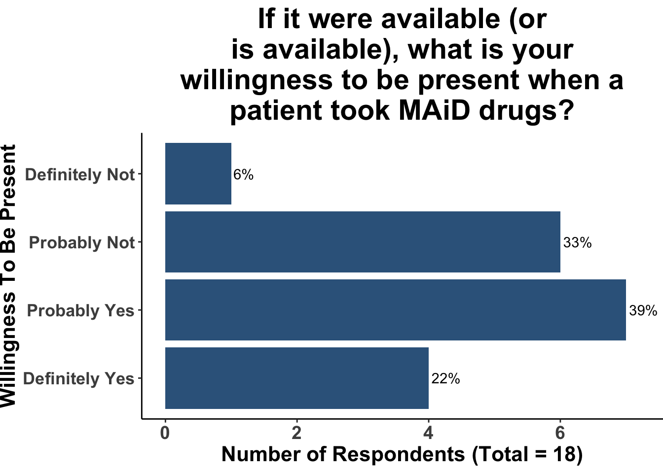 When asked about willingness to refer patients for MAiD, the vast majority of participants expressed conditional willingness, based on patient prognosis and quality of life considerations (Figure 5). In contrast, opinions on willingness to be presence during MAiD, were more split, highlighting the personal and ethical complexities of MAiD and potentially the differences in exposure to the practice among the participants (Figure 6).