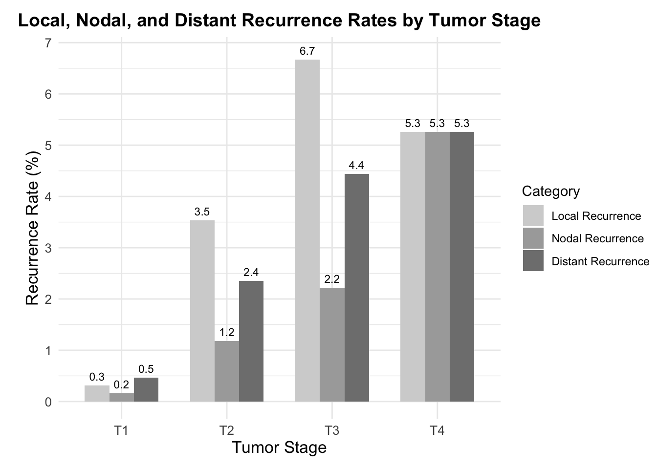 The study encompassed the treatment of 785 melanoma cases with variances in thickness between 0.3mm and 8.5mm through MMS. Following treatment, recurrence details were analyzed which revealed that local recurrence was observed in 0.51% (approximately 4 out of 785 cases), nodal recurrence was seen in 1.0% (approximately 8 out of 785 cases), and distant recurrence in 1.1% (approximately 9 out of 785 cases). When delving into the recurrence rates according to tumor stages T1 to T4, the study indicated that local recurrence stood at 0.16% for T1 stage (1 out of 636 cases), 1.18% for T2 stage (1 out of 85 cases), 2.22% for T3 stage (1 out of 45 cases), and 5.26% for T4 stage (1 out of 19 cases) (Figure 3). The survival rates after five and ten years were also promising, with disease-specific survival calculated at 96.8% (with a 95% confidence interval between 95.0% and 98.5%) and 93.4% (with a 95% confidence interval between 88.5% and 98.3%) respectively.