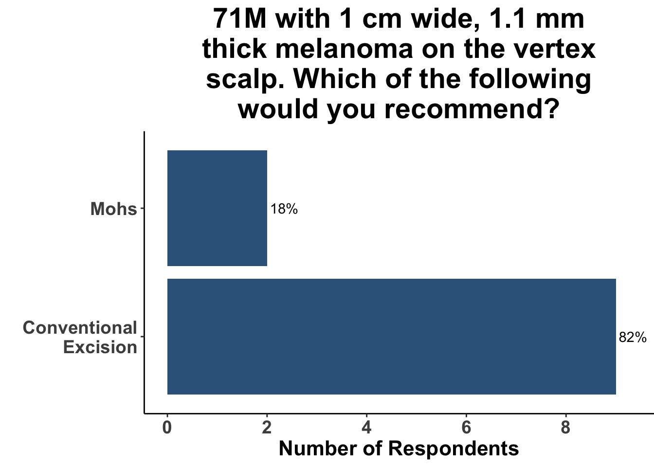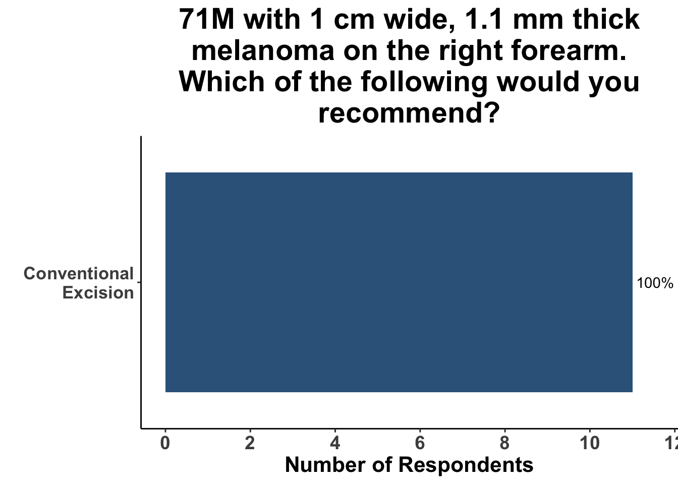 Inputs were sought from the experienced, multi-disciplinary SoCO group regarding their preferred treatment modality based on hypothetical clinical scenarios. In consideration of a case involving a 71-year-old male patient with a 1 cm wide, 1.1 mm thick melanoma on the vertex scalp, a quarter of the participants expressed a preference for MMS as their treatment method while the remaining 75% supported the conventional excision technique. Another case, involving the same measurements of melanoma but located on the right forearm of the male patient, saw unanimous consensus for conventional excision as the treatment method (Figures 4 and 5).