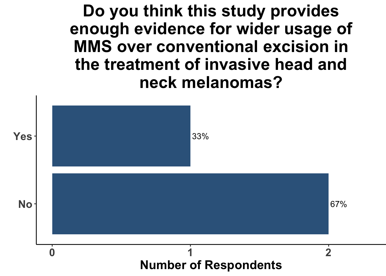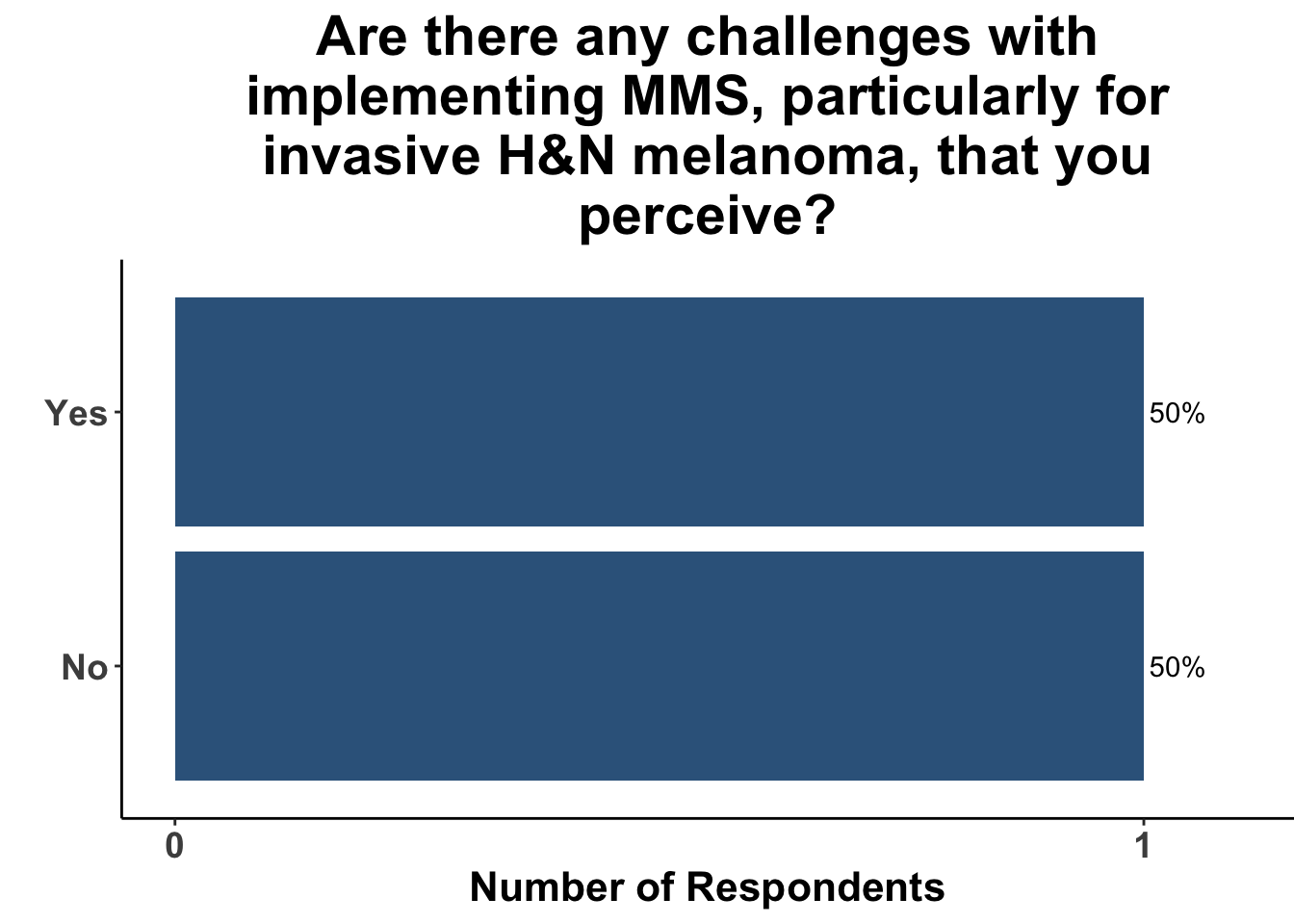 After discussion of the article, 17% of respondents felt the study provided adequate evidence for a shift towards MMS for the treatment of invasive head and neck melanomas (Figure 6). In terms of the utility of MMS over conventional excision, one-fifth of the clinicians anticipated potential changes in their medical practice (Figure 7). A majority of the participants (91%) felt that while MMS for invasive head and neck melanoma may show promise, challenges remain in terms of incorporating MMS into their own practice (Figure 8). This suggests the opportunity for prospective randomized trials or even matched case-control studies comparing surgical interventions.