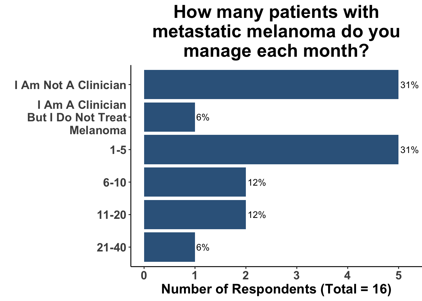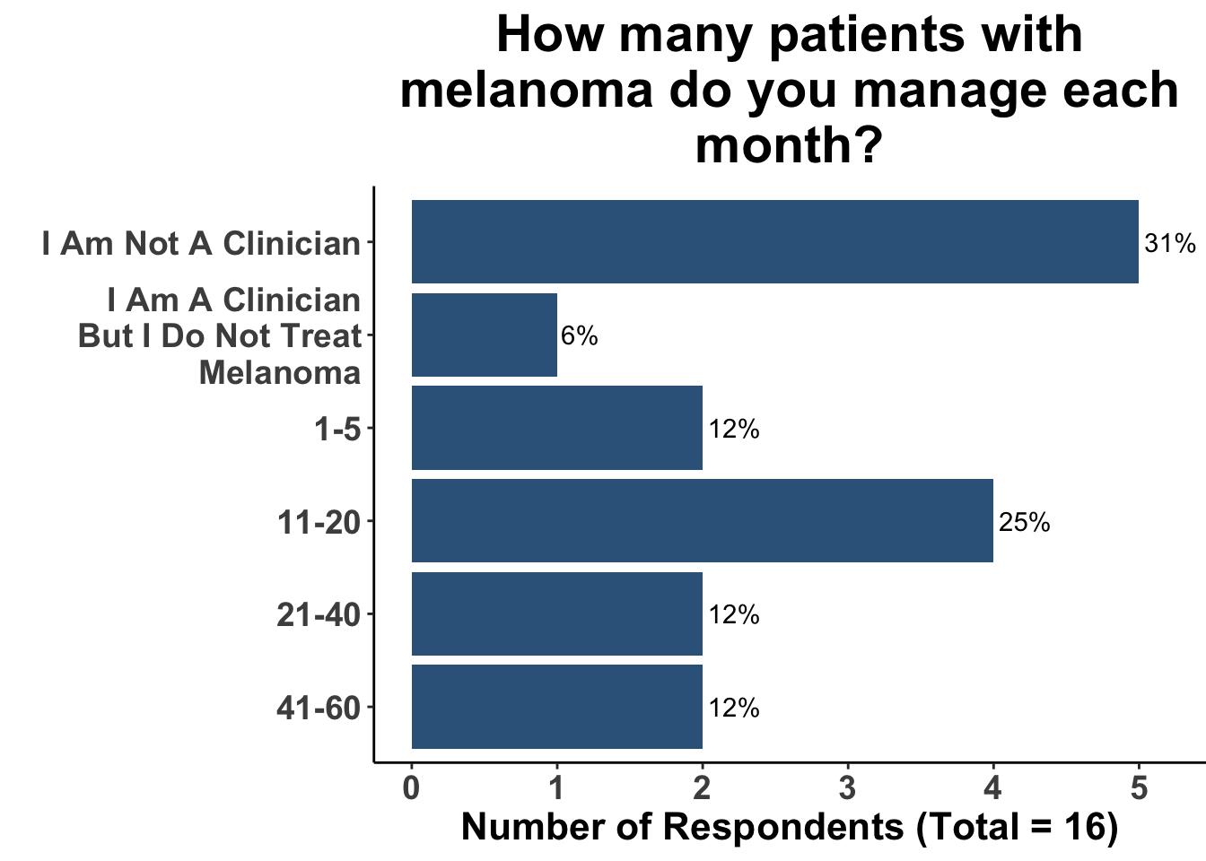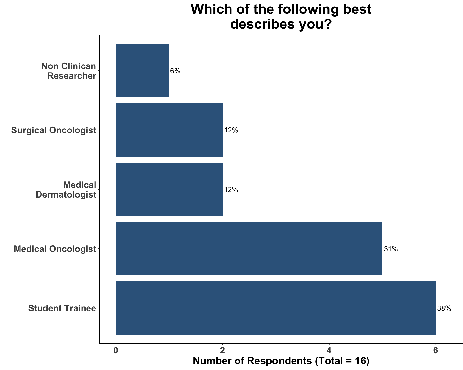 On November 8th, 2024, the multi-institutional Society of Cutaneous Oncology (SoCO) Journal Club (JC) reviewed the Journal of Clinical Oncology article titled “First-Line Nivolumab Plus Relatlimab Versus Nivolumab Plus Ipilimumab in Advanced Melanoma: An Indirect Treatment Comparison Using RELATIVITY-047 and CheckMate 067 Trial Data.” Participants in this session included non-clinician researchers, student trainees, and predominantly clinicians specializing in surgical oncology, medical dermatology, or medical oncology (Figure 1). Attendees represented institutions such as Massachusetts General Hospital, Mass Eye and Ear Infirmary, National Institutes of Health, and others. The participants’ relative experience in managing melanoma and metastatic melanoma varied (Figure 2).