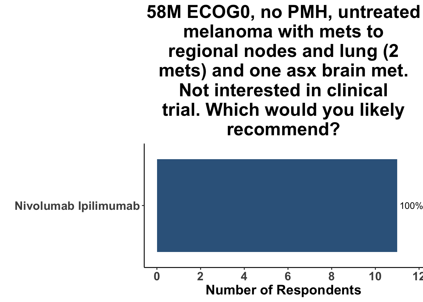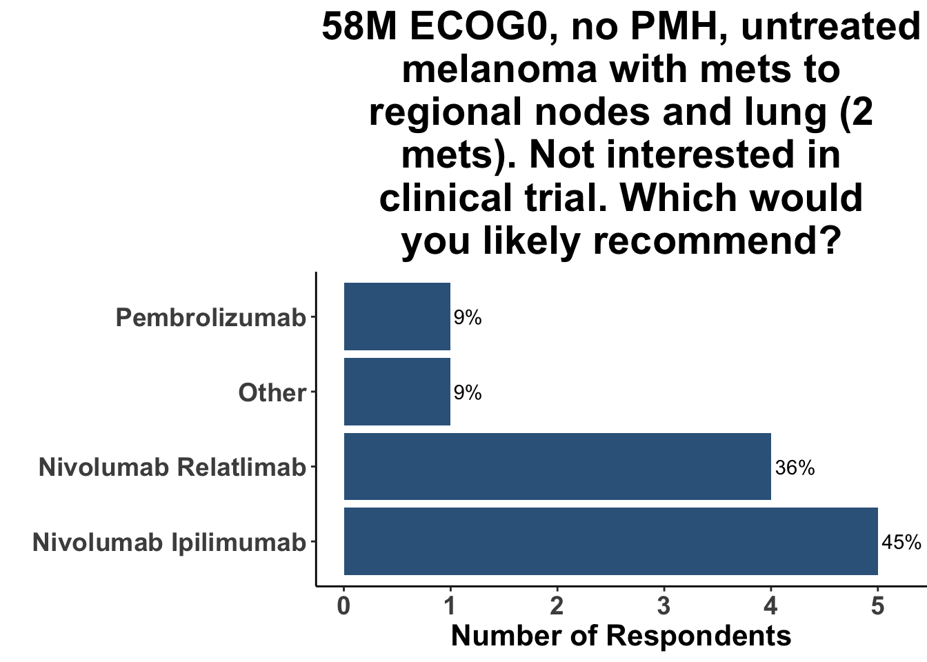 During the discussion, both Nivo/Rela and Nivo/Ipi were considered reasonable first-line treatment options for advanced melanoma, with the study not providing strong enough evidence to favor one regimen definitively. Treatment selection was viewed as a multifaceted decision influenced by factors such as disease progression rate, BRAF mutation status, presence of brain metastases, patient preference, and potential toxicities. This was reflected in the survey responses (Figure 4), where participants were asked how they would manage a hypothetical patient with metastatic melanoma. In the case of a patient with regional and pulmonary metastases, the majority selected Nivo/Ipi (45%) or Nivo/Rela (36%), indicating a lack of consensus on the optimal regimen. However, when brain metastases were introduced, all respondents recommended Nivo/Ipi, reflecting the well-established efficacy of this regimen in patients with intracranial metastases and the paucity of data supporting Nivo/Rela in this setting11. These findings highlight that while toxicity considerations play a role in treatment selection, clinicians weigh multiple factors—including central nervous system activity—when deciding between regimens.