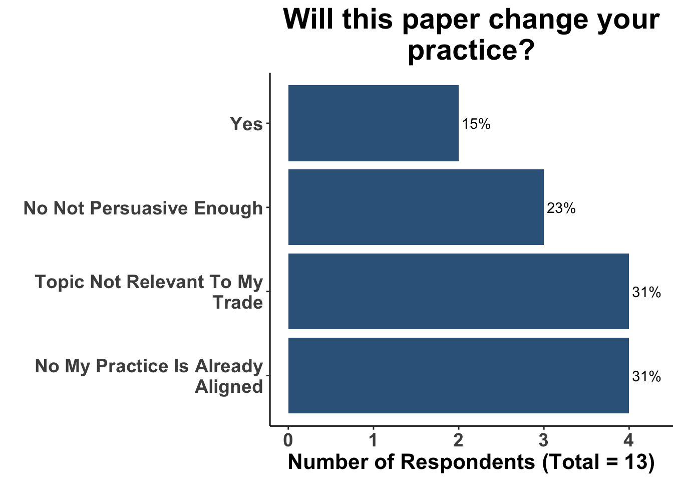 Advances in melanoma management have led to the development of multiple effective immunotherapy regimens, significantly improving patient outcomes. However, the absence of direct, head-to-head trials comparing these regimens presents a challenge for clinicians in selecting the most appropriate therapy. To address this gap, the authors conducted an indirect treatment comparison using propensity score weighting to evaluate the efficacy and safety of Nivo/Rela versus Nivo/Ipi in advanced melanoma. Their analysis did not detect significant differences in efficacy between the two regimens across key outcomes, including PFS, OS, and ORR. However, Nivo/Rela was associated with a lower incidence of high-grade treatment-related adverse events, suggesting a potential advantage in tolerability. Despite this, the consensus among the journal club participants was that the study was not particularly practice-changing (Figure 3). Of the 9 respondents who actively manage melanoma patients, four indicated their current approach was already aligned with the findings, while three felt the paper was not compelling enough to alter their practice.