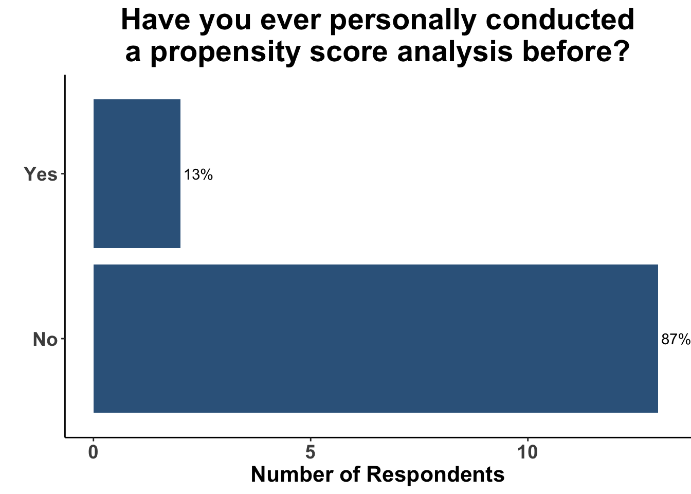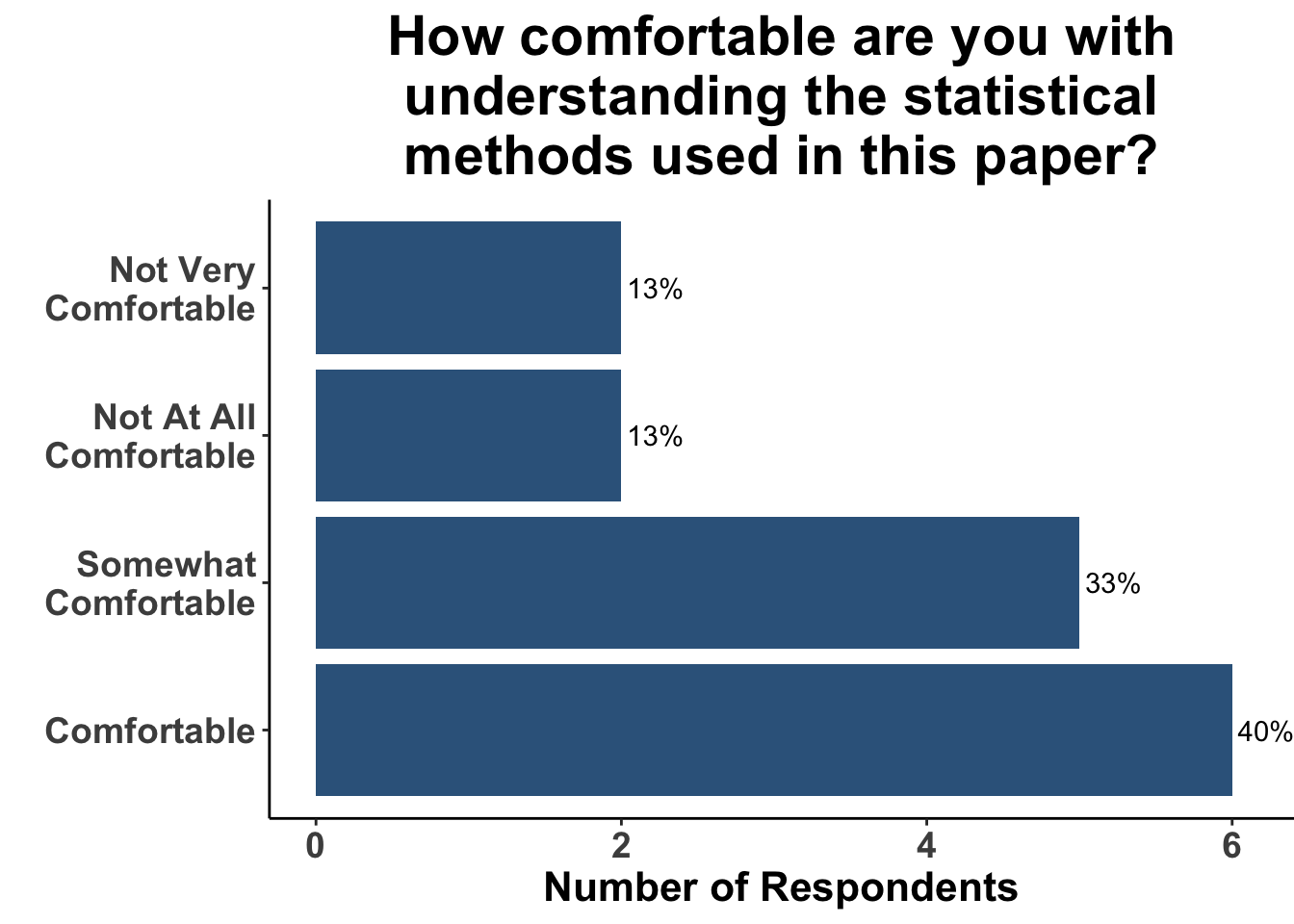 Another key theme that emerged during the discussion was the role of clinician familiarity with statistical methodologies in interpreting and applying study findings. While indirect treatment comparisons offer a valuable approach when head-to-head trials are unavailable, their complexity may limit their influence on clinical practice. The majority of journal club participants were clinical experts and academic physicians with research expertise outside the field of biostatistics, and most had never personally conducted a propensity score analysis (Figure 5). Additionally, 26% of respondents reported being “Not at all” or “Not very” comfortable with the statistical methods used in the study (Figure 6). This may represent a barrier to changing practice, as clinicians could be more inclined to adopt findings from studies that use more familiar study designs or analytical approaches. As a result, while the methodology in this analysis was rigorous, its impact on real-world treatment decision-making may be tempered by the challenge of translating complex statistical models into actionable clinical insights.