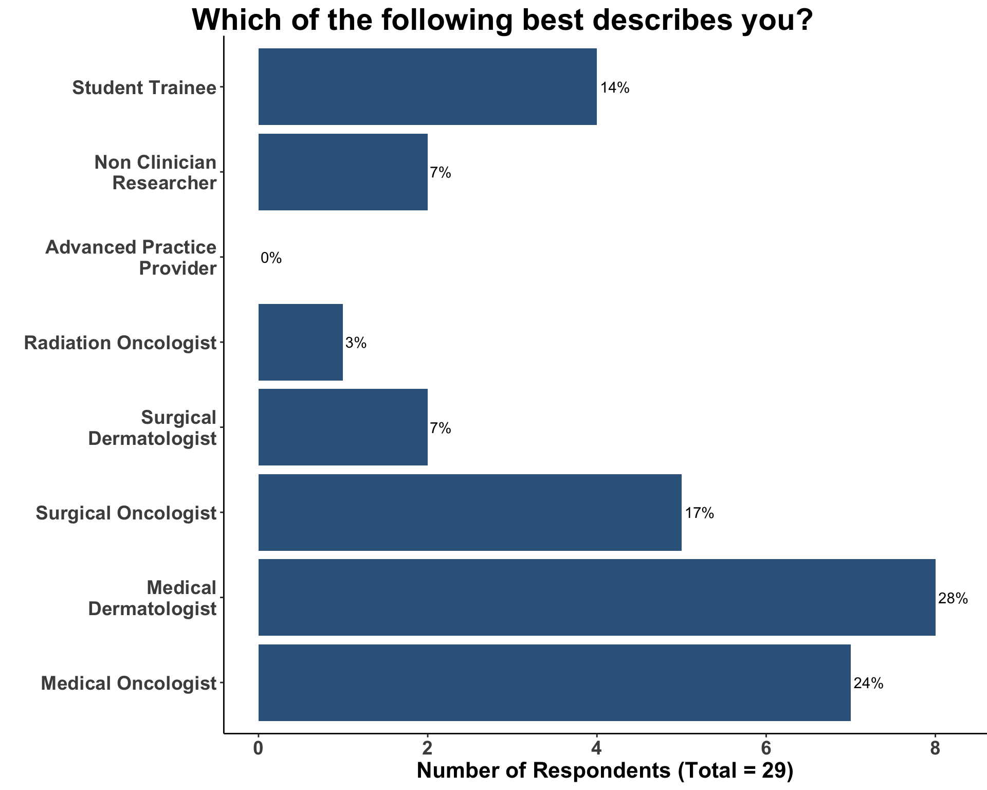 Attendees represented a range of institutions, including Massachusetts General Hospital, Mass Eye and Ear Infirmary, University of Washington, Moffitt Cancer Center, Dana-Farber Cancer Institute, Brigham and Women’s Hospital, Northwestern University, and the National Institutes of Health. Their experience managing Merkel Cell Carcinoma (MCC) varied (Figure 2).