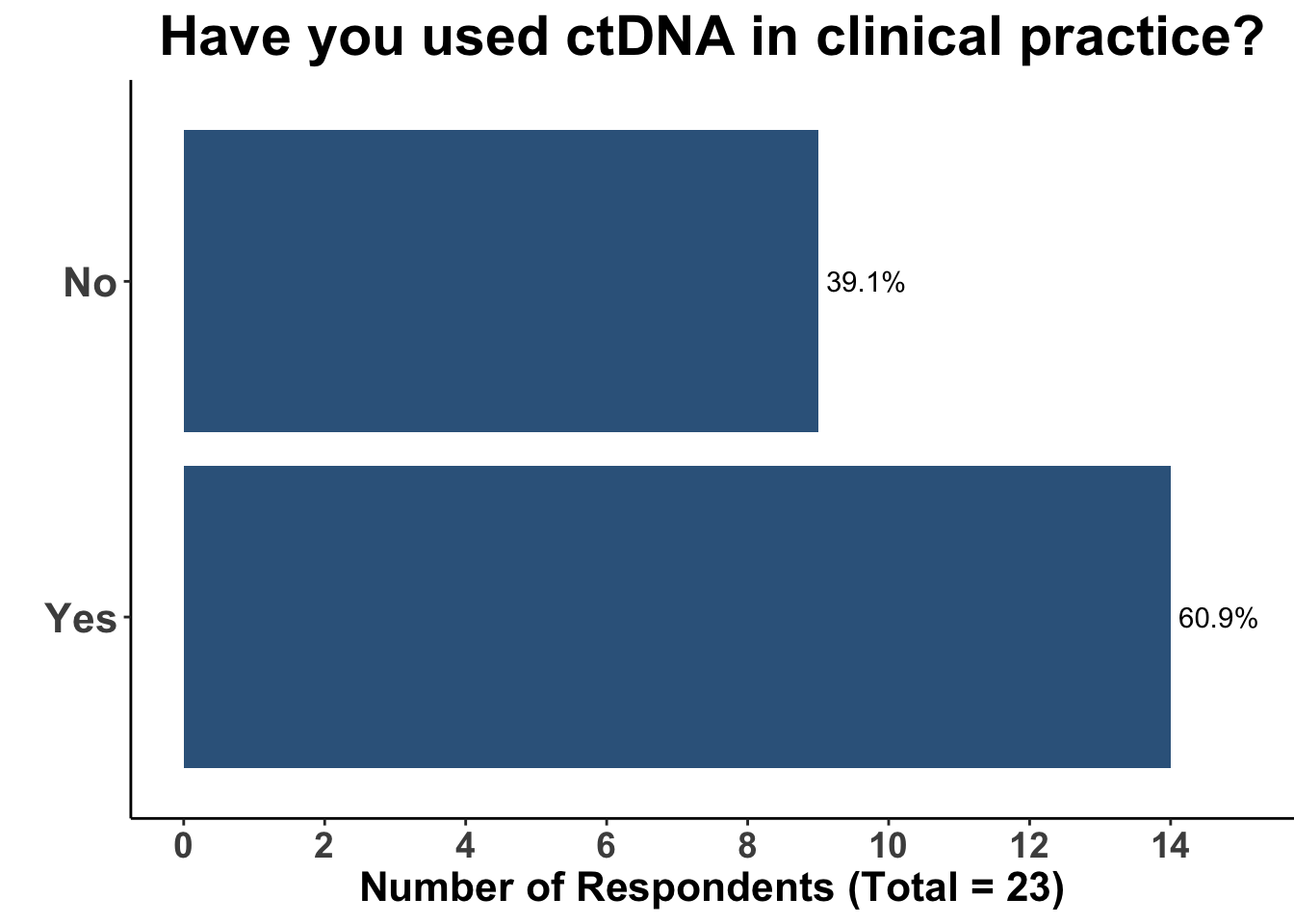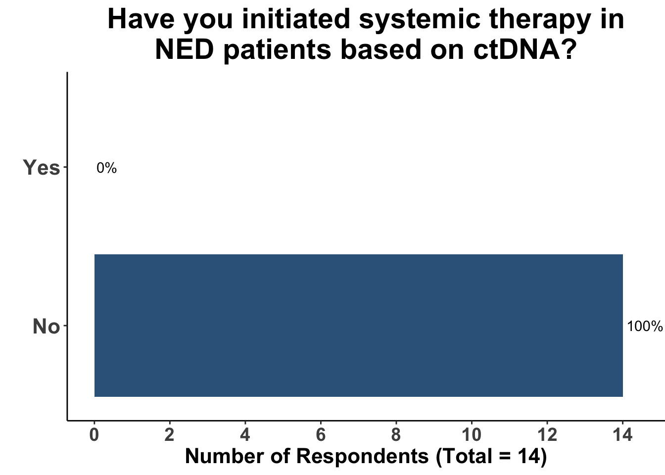 While no patients have been initiated on ICI solely based on a low ctDNA level in the absence of clinical disease, many clinicians use ctDNA to guide therapy adjustments. Specifically, persistent ctDNA detection while on immune therapy may influence decisions against discontinuing treatment. This suggests that ctDNA may have a greater role in treatment de-escalation strategies rather than in initiating therapy, highlighting the need for more structured guidance on its role in long-term management.